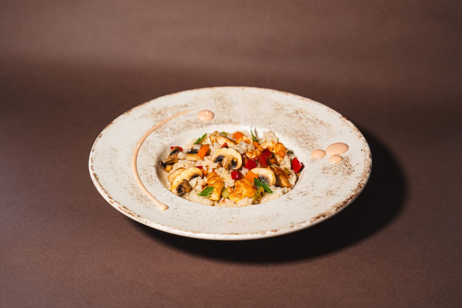 Rizoto me fileto pule, kërpudha, speca dhe erëza natyrale. E shoqëruar me salcë të lehtë pikante.
