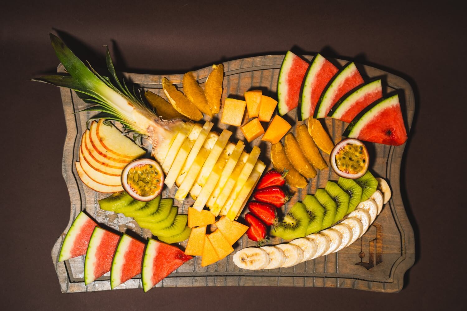 Përzierje frutash të freskëta të stinës me ananas, banane, kivi, shalqi, pjepër, frut pasioni, portokall, mollë dhe dredhëza.